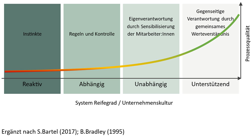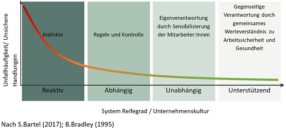 In den letzten Jahren hat sich die Forschung mit diesem Thema der Arbeitssicherheit intensiv beschäftigt. Eine der bekanntesten Arbeiten geht dabei auf Bardley (1995, Mitarbeiter bei Dupont) zurück und stellte die Abhängigkeiten unterschiedlicher Einflussfaktoren wie Unternehmenskultur – Anzahl der unsicheren Situationen/ Unfallhäufigkeit in der sogenannten Bradley Kurve dar. Sie basiert auf dem Konzept der „Behavioral Based Safety“, also dem etablierten Prinzip, dass Arbeitssicherheit nur durch Bewusstsein = Verhaltensänderung nachhaltig verbessert werden kann.